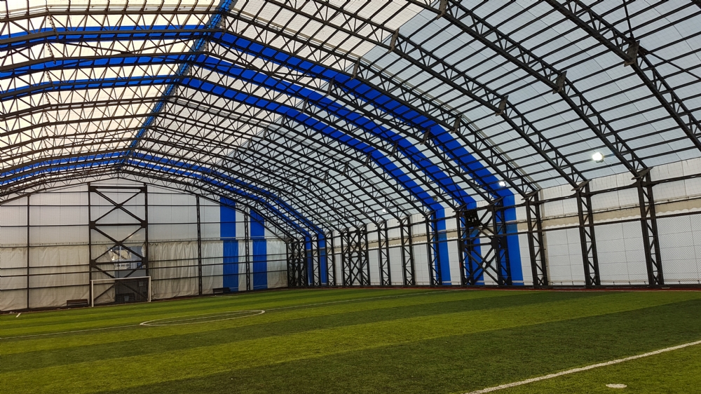 Daha önce etüdü yapılıp projesi hazırlanan kapalı halı sahanın metal ve (branda, aydınlatma, ağ, tel-çit, suni çim halı) diğer malzemeleri hazırlanır. Gövde makaslarına, (sahanın genişliğine göre 12mt-15mt arası) kavis verilir. Ø114×3 mm borudan meydana gelen taşıyıcı ayak makaslarının içerisine, Ø42×3 mm borular diyagonal olarak monte edilir. Konstrüksiyonun uzun kenarına 3 sıra rüzgâr bağlantısı Ø42x3mm borudan kaynaklanarak monte edilir. Ø76x3mm borudan meydana gelen gövde makaslarının arasına Ø27x3mm borular çapraz ve diyagonal bağlantılar kaynak ile sabitlenir. Bu uygulama taşıyıcı ayak makasları ile yerde bir birleriyle monte edilir. Birleştirilen makaslar vinç yardımı ile kaldırılıp daha önceden hazırlanan 10mm sac plakanın üzerine yerleştirilir. Kaldırılan makaslar üzerine 70 cm’ de bir Ø42x3mm den oluşan borular yardımı ile aşıklar kaynatılır. Bu aşıklar makasların birbirine olan bağlantılarını sağlar ve brandanın sarkmasını önler. Bunlara her 6 m’ de bir branda bağlama boruları monte edilir. Konstrüksiyonun uzun kenarına 3 sıra rüzgar bağlantısı Ø42x3mm borudan kaynaklanarak monte edilir. Halı sahanın üst kısmına hava akımını sağlaması için komple havalandırma yapılır. Projektörler için halı sahanın ortasından geçecek şekilde boydan boya yürüme alanı monte edilir. Bu alana oyuncuların halı sahada top oynarken serinliye bilmesi için su fıskiyeleri de koyulabilir. Halı sahaya giriş kapısı konstrüksiyona ilave edilir. Sahaya uygun kale direkleri ve kale ağları yapılır. Konstrüksiyon yeşil renkte endüstriyel boya ile boyanır.